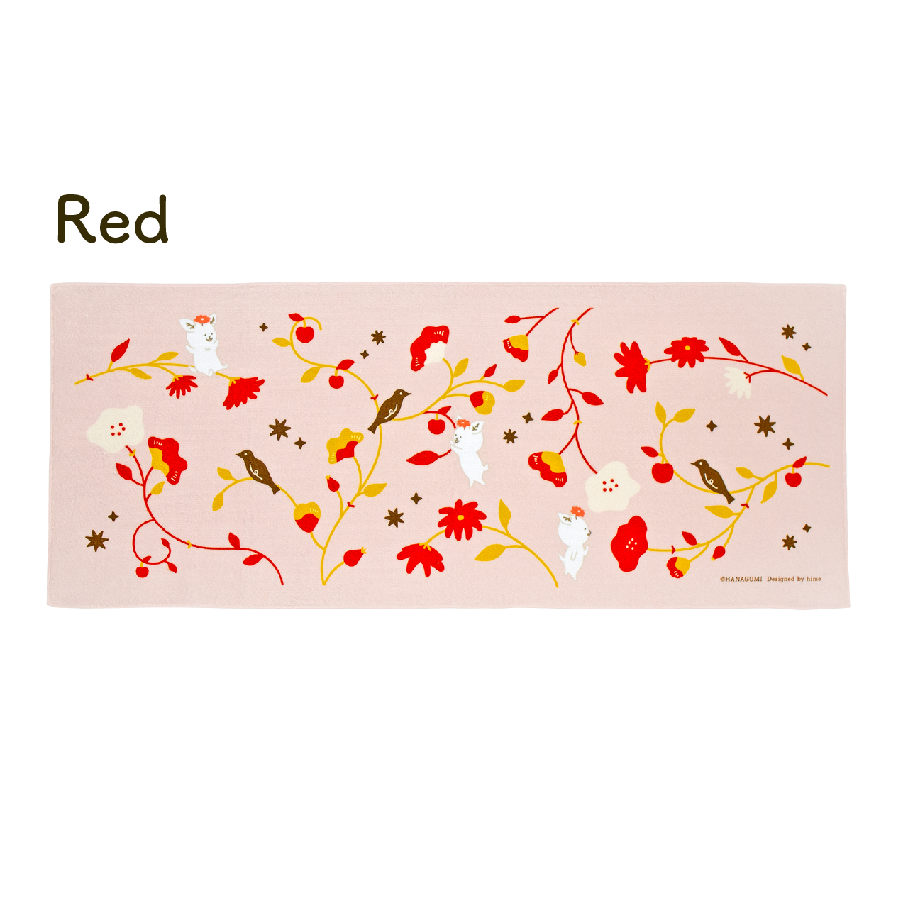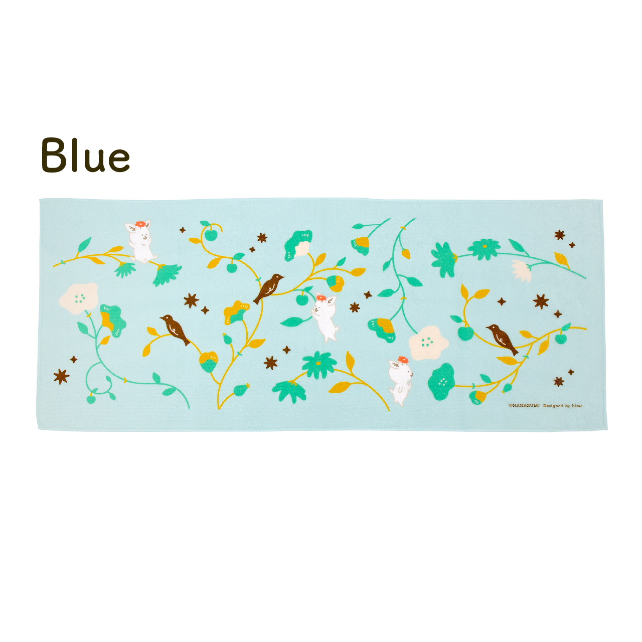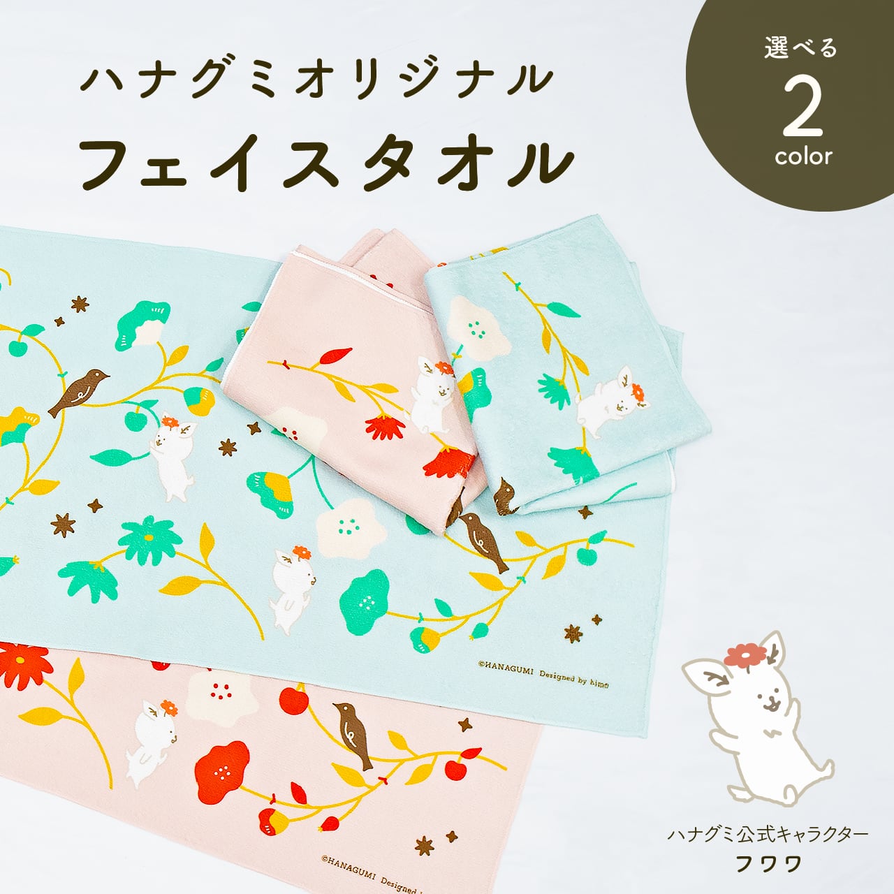 花を見つめたり、りんごに手を伸ばしたり。 ハナグミ公式キャラクター・フワワちゃんの、のんびり過ごす姿を描きました。 吸水性のあるコットン生地とやさしい手ざわりで毎日の暮らしがちょっと楽しくなりそう。